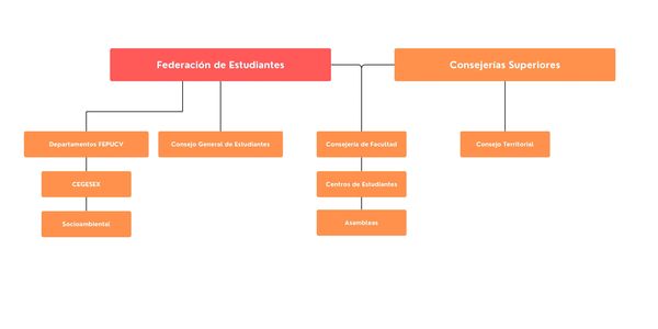 La FEPUCV es parte de una amplia estructura de organización estudiantil, que incluye a los Consejerxs Superiores, Consejerxs de Facultad, Asambleas, Centros de estudiantes, y el CGE (Consejo General de Estudiantes). Todas estas organizaciones están compuestas por estudiantes electos, y cumplen el gran deber de representar a todas y todos los estudiantes de la PUCV.